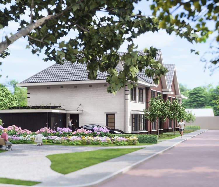 De 4 woningen hebben een jaren ’30 uitstraling en om samenhang te creëren in het ontwerp, is de hoofdvorm van de twee blokken gelijk. Het verschil in de kleur van de gevels en de afwisseling met erkers en de voordeur wel of niet aan straatzijde geven de woningen een uniek en villa-achtig karakter. Naast de woningen wordt een hofje gecreëerd met een houten zitbank.